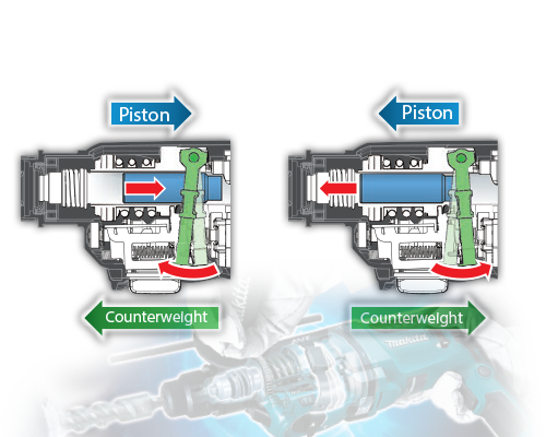 Les petites perceuses et les marteaux combinés utilisent un système mécanique dans lequel le palier oscillant du piston contrôle également le contrepoids et le déplace dans la direction opposée au piston afin de minimiser les vibrations.