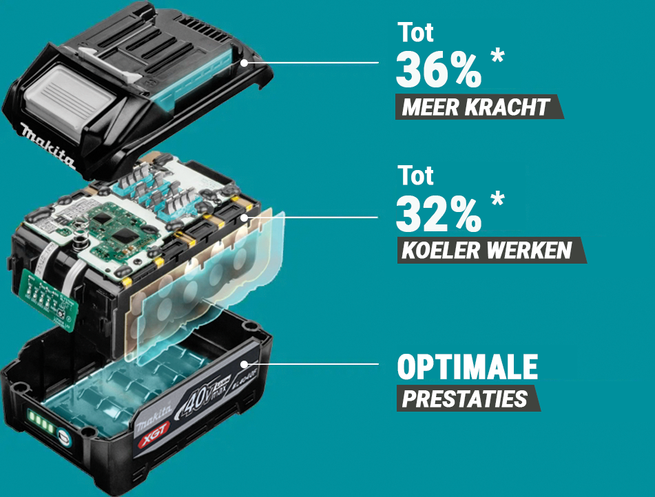 Deze nieuwe generatie cellen zijn exclusief verkrijgbaar op de BL4040F en zijn ontworpen met geavanceerde technologie. Tabloze lithium-ion cellen zorgen voor een veel efficiëntere stroomtoevoer. De cellen voorkomen stroomconcentratie door het hele uiteinde van de elektrode aan te sluiten op het uiteinde van de cel in plaats van de lipjes. Dit verbetert de efficiëntie, het thermisch beheer en de algehele prestaties van de batterij.